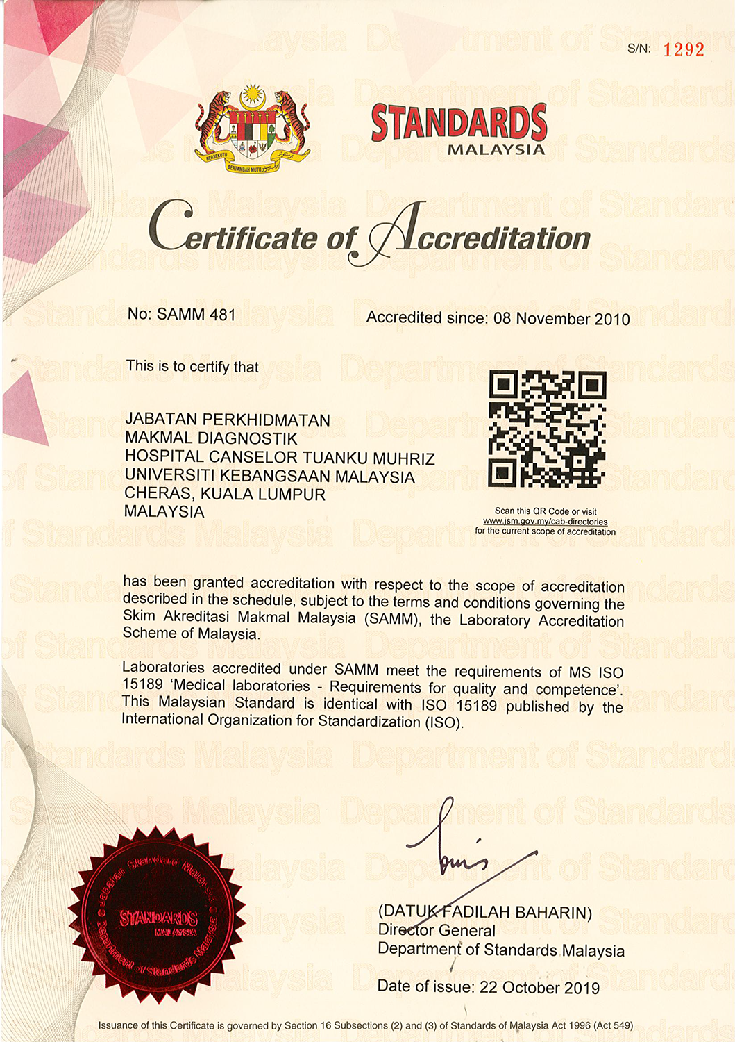 Pengiktirafan Pensijilan Program MS ISO 15189 ‘Medical Laboratories – Requirements for quality and competence’