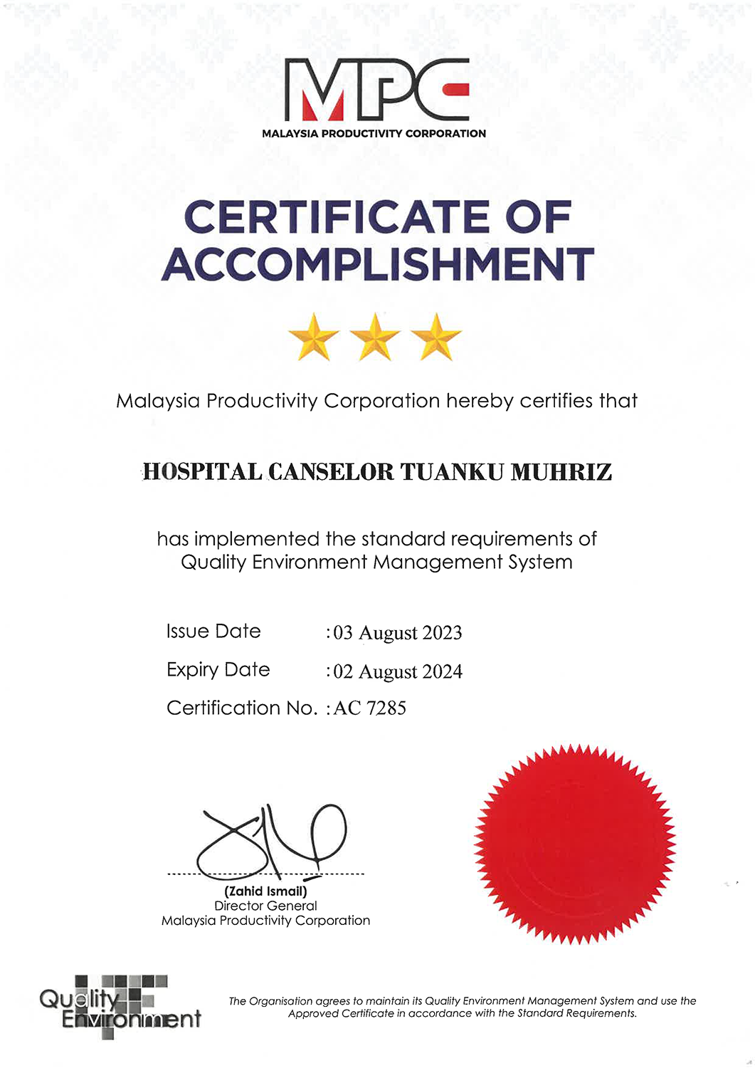 Pengiktirafan Pensijilan Program Quality Environment Management System oleh Malaysia Productivity Corporation (MPC)