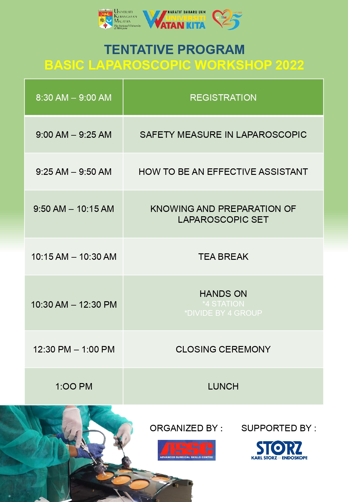 Pusat Kemahiran Pembedahan Termaju (ASSC) telah menganjurkankan Bengkel Basis Laparoscopic 2022 bertempat di Wetlab Tingkat 4, ASSC pada 22 September 2022 yang lalu. Bengkel yang dihadiri oleh 34 orang pelatih telah didedahkan teknik asas laparoskopi dan memperoleh kemahiran dan pengetahuan dalam mengendalikan instrumen laparoskopi dan kamera. Pelatih juga mempelajari teknik dalam kamera laparoskopi dan pengendalian instrumen, teknik dalam jahitan laparoskopi dan ikatan simpulan, elektrosurgeri dalam laparoskopi, akses selamat ke perut dan pertimbangan sebelum dan selepas pembedahan.