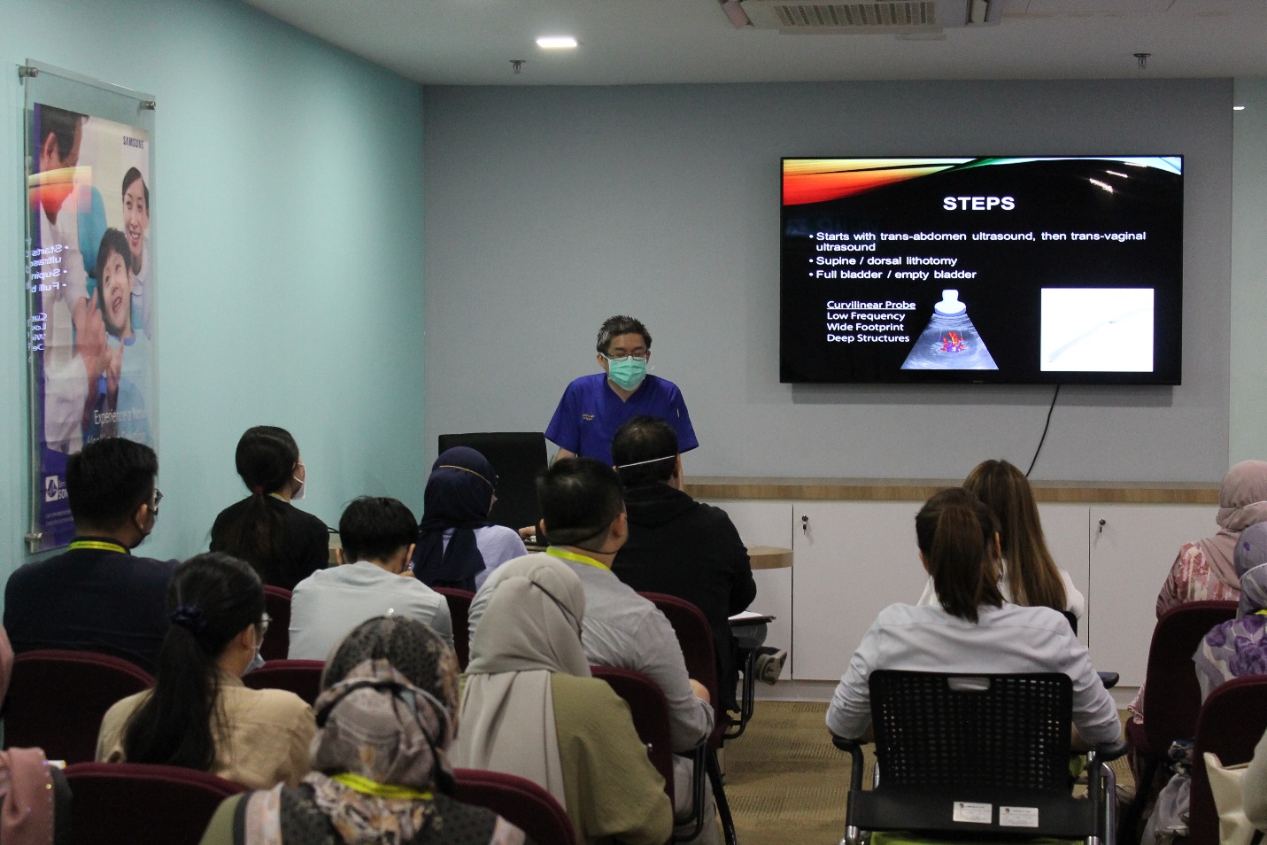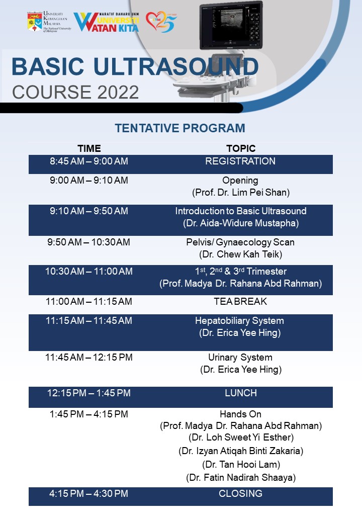 Kursus Basic Ultrasound 2022 telah dijalankan pada 27 Oktober 2022 di Samsung Sono School, Tingkat 1, ASSC. Anjuran bersama Jabatan Obstetrik dan Ginekologi juga Jabatan Radiologi ini telah disertai seramai 35 orang peserta. Objektif kursus ini adalah untuk meningkatkan pemahaman asas tentang prinsip asas ultrasound. Peserta boleh menggunakan prinsip ini untuk mengurangkan artifak biasa dan penambahbaikan imej ultrasound diagnostik berkualiti tinggi, memahami hubungan antara kedudukan transducer dan orientasi imej dan kawalan pengendali asas pada sistem ultrasound yang diperlukan untuk pemerolehan imej.