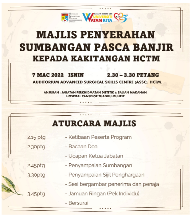 Jabatan Dietetik dan Sajian Makanan telah menganjurkan Majlis Penyerahan Sumbangan Pasca Banjir Kepada Kakitangan HCTM telah diadakan pada 7 Mac 2022 pada jam 2.30 petang di Auditorium ASSC. Program anjuran Jabatan Dietetik dan Sajian Makanan. Objektif penganjuran adalah untuk membantu kakitangan HCTM yang terkesan dengan bencana banjir.