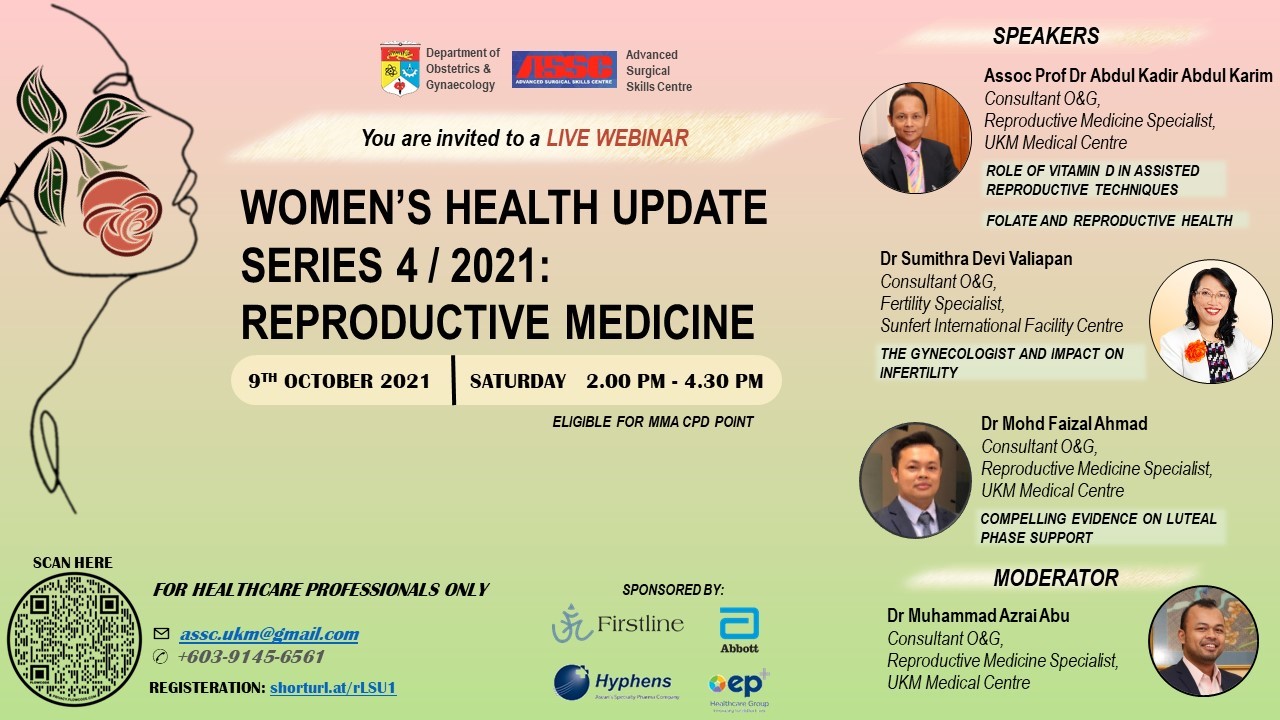 Webinar Women’s Health Update Series 4/2021 : Reproductive Medicine telah diadakan pada 9 Oktober 2021, jam 2.00 hingga 4.30 petang.