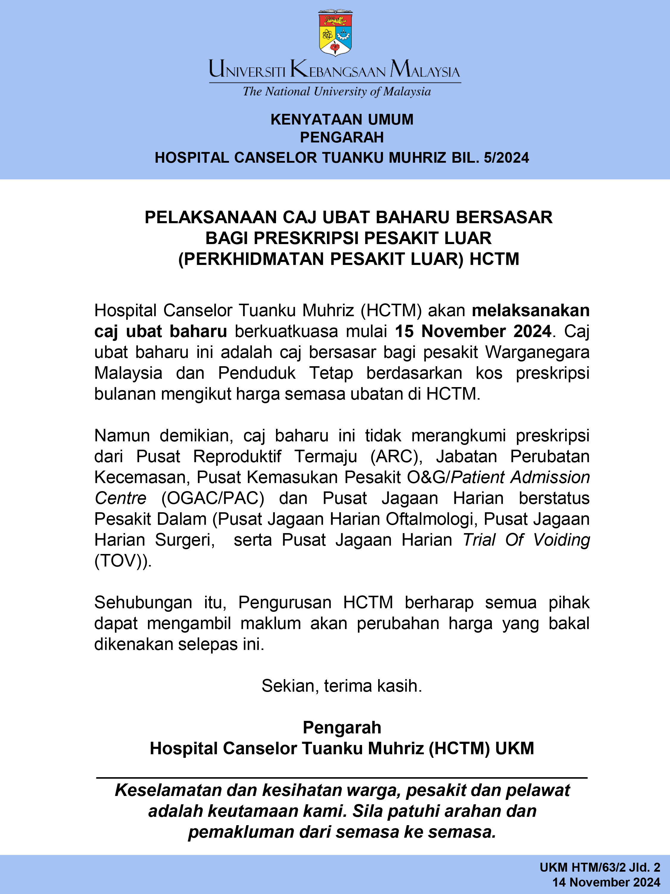 Majlis Pelancaran Kemudahan Terkini Hospital Canselor Tuanku Muhriz (HCTM) yang berlangsung pada 2 Disember 2024 (Isnin) di Lobi Utama HCTM bertujuan untuk memperkenalkan pelbagai kemudahan baharu yang disediakan oleh hospital ini. Pelancaran ini dirasmikan oleh YBhg. Prof. Emeritus Dato’ Dr. Mohamad Abd. Razak, Pengerusi Lembaga Pengarah Universiti Kebangsaan Malaysia.