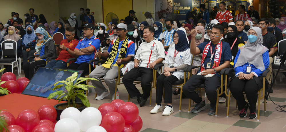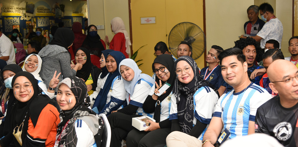 CHERAS ,16 Disember 2022 – Tema Bola Sepak Piala Dunia Qatar 2022 telah dipilih secara spontan untuk Majlis Perhimpunan Kakitangan HCTM Bil.3/2022. Pendekatan ini memberikan kelainan berbanding sebelumnya apabila warga HCTM termasuk barisan pengurusan HCTM hadir memakai jersi bola. Perhimpunan dimulakan dengan tayangan aktiviti dan ucapan Pengarah HCTM. Prof. Dato’ Razman Jarmin, Pengarah HCTM dalam ucapannya mengucapkan tahniah kepada warga HCTM yang telah mengharumkan nama hospital dengan aktiviti-aktiviti peringkat kebangsaan dan antarabangsa. Beliau juga turut memaklumkan Majlis Perasmian Sambutan Jubli Perak 25 HCTM dan Pelancaran Logo Rasmi HCTM dan Buku Coffee Table 25 Tahun HCTM serta Perasmian Wad Tuanku Canselor yang berlangsung pada 19 Oktober 2022 yang lalu telah berjalan lancar hasil kerjasama dan semangat berpasukan warga HCTM.