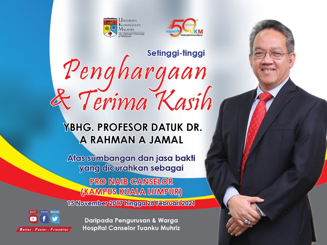 Setinggi-tinggi penghargaan dan terima kasih diucapkan kepada YBhg Prof. Datuk Dr. A Rahman A Jamal atas sumbangan sebagai Pro-Naib Canselor Kampus Kuala Lumpur UKM dari 15 November 2017 sehingga 28 Februari 2021.