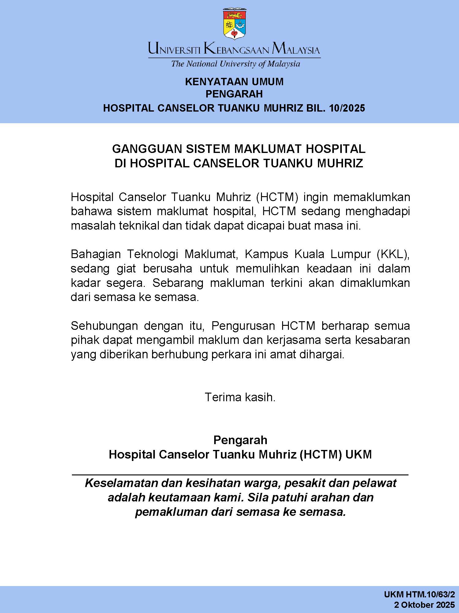 Hospital Canselor Tuanku Muhriz (HCTM), Universiti Kebangsaan Malaysia (UKM), through its Department of Psychiatry, successfully organised the opening ceremony of the World Mental Health Day 2025 Celebration along with the Launch of the TULUS and KASIH Units on Friday, 10 October 2025, at the Auditorium, Chancellor Tuanku Ja’afar Medical Education Complex, HCTM. The ceremony was officiated by Professor Dr. Nik Ruzyanei Nik Jaafar, Head of the Department of Psychiatry, on behalf of the Director of HCTM.