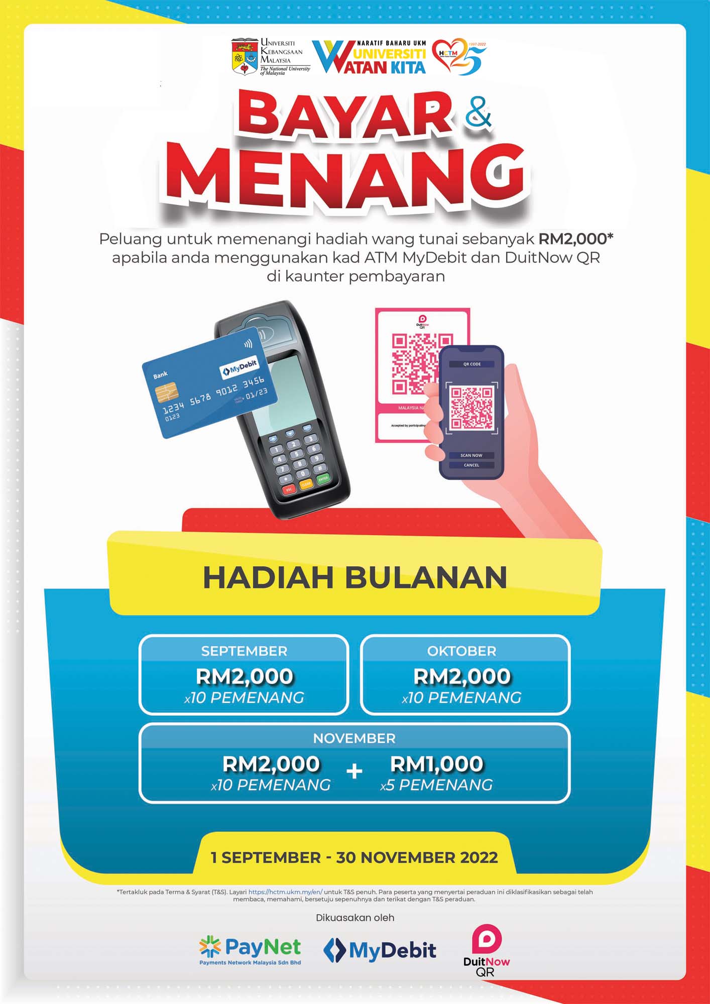 The ‘PAY & WIN’ campaign is an initiative of Universiti Kebangsaan Malaysia Kuala Lumpur Campus in collaboration with Payments Network Malaysia Sdn Bhd to encourage the use of ATM myDebit or DuitNow QR as a payment medium. You have a chance to win a cash prize of RM2000 when using myDebit ATM card and DuitNow QR at the payment counter.