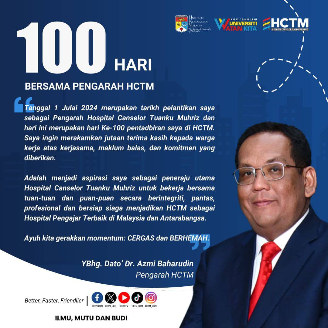 Turut hadir sama YBhg. Dato’ Dr. Azmi Baharudin, Pengarah HCTM, Prof. Madya Dr. Jamari Sapuan, Timbalan Pengarah (Perkhidmatan Surgeri), Dr. Zairul Azwan Mohd Azman, Timbalan Pengarah (Perkhidmatan Perubatan), Encik Mursidi Mursidi Ahamad, Timbalan Pengarah Pentadbiran, Puan Wan Omi Wan Yussop, Ketua Jabatan Kewangan, dan Puan Masrifah Zakaria, Ketua Jabatan Perkhidmatan Kejururawatan.