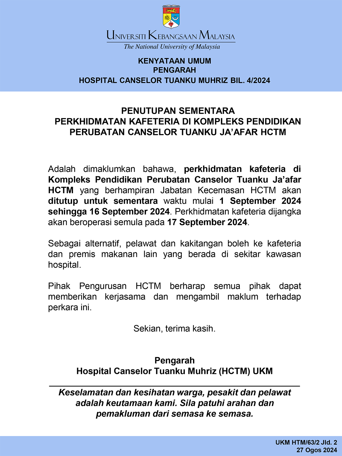 Speaking at the ceremony, the Director of HCTM said through exposure and knowledge about the risks that can cause breast cancer, society will be more aware and change a healthy lifestyle such as choosing healthy foods, exercising regularly and maintaining an ideal body weight. Some of the activities carried out were the talk entitled ‘Don’t Panic, act wisely: Early Guidance If there’s a lump’ was delivered by YBhg. Prof. Dr. Norlia Abdullah, Professor & Consultant Surgeon, Head of Breast & Endocrine Surgery Unit, Department of Surgery HCTM, cancer servivor’s sharing session, Dr. Kartini Kamalul Ariffin, booth exhibition, and a series of talks on cancer held on October 1, 2024.
