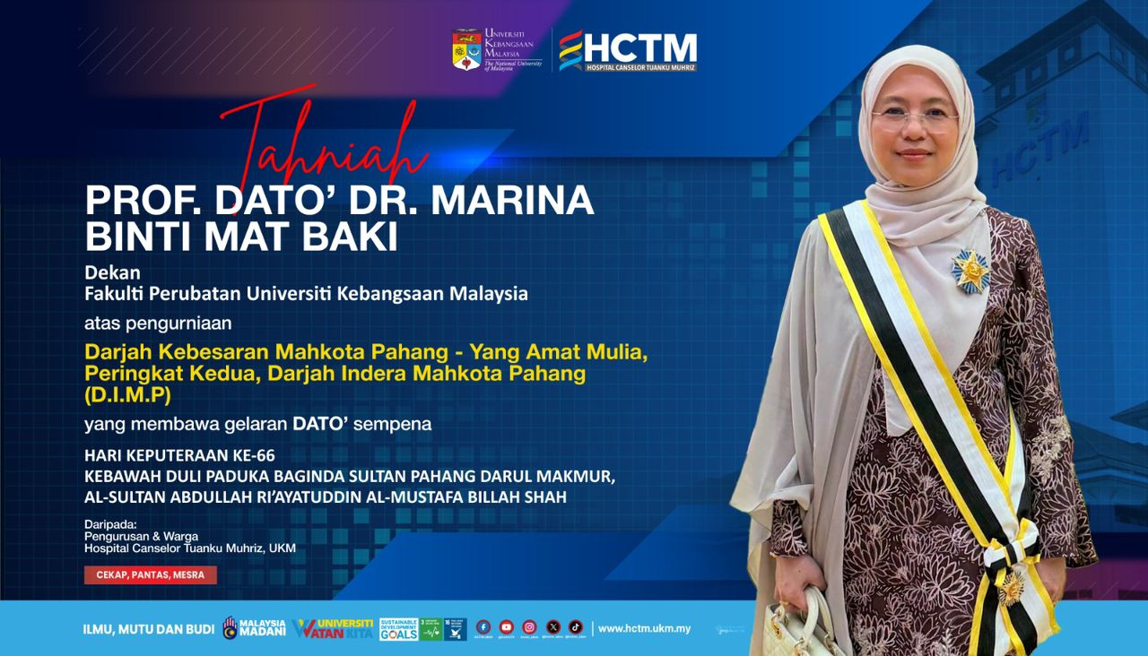 Tahniah YBhg. Prof. Datoโ Dr. Marina Mat Baki, Dekan Fakulti Perubatan (FPER) Universiti Kebangsaan Malaysia (UKM) atas pengurniaan Darjah Kebesaran Mahkota Pahang – Yang Amat Mulia, Peringkat Kedua, Darjah Indera Mahkota Pahang (D.I.M.P) yang membawa gelaran Datoโ sempena Istiadat Pengurniaan Darjah-Darjah Kebesaran dan Pingat-Pingat Negeri Pahang Darul Makmur Sempena Memuliakan Ulang Tahun Hari Keputeraan Yang Ke-66 Kebawah Duli Paduka Baginda Sultan Pahang, Kebawah Duli Paduka Baginda Sultan Pahang, Al-Sultan Abdullah Riโayatuddin Al-Mustafa Billah Shah Ibni Almarhum Sultan Haji Ahmad Shah yang diadakan pada hari 14 April 2026.