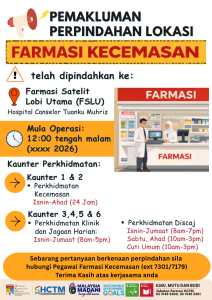 Mulai bulan Mei 2026, Farmasi Kecemasan di Hospital Canselor Tuanku Muhriz akan berpindah ke Lobi Utama berikutan kerja penyelenggaraan dan pengubahsuaian bangunan. Sehubungan itu, pesakit di Jabatan Kecemasan diingatkan untuk mengambil ubat di Farmasi Satelit Lobi Utama (berdepan dengan kaunter hasil). Untuk sebarang pertanyaan atau cadangan, sila hubungi talian 03-91457301 atau 03-91457179.