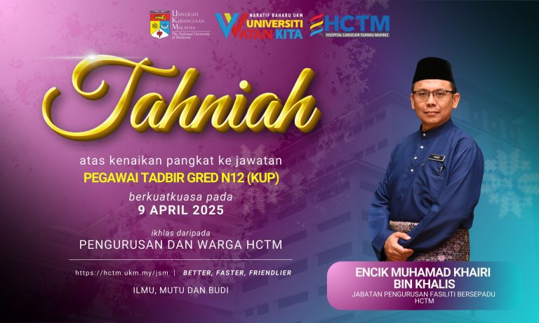 Tahniah diucapkan kepada Encik Muhamad Khairi Khalis, Ketua Unit Kemudahan Kakitangan, Jabatan Pengurusan Fasiliti Bersepadu, HCTM di atas kenaikan pangkat...