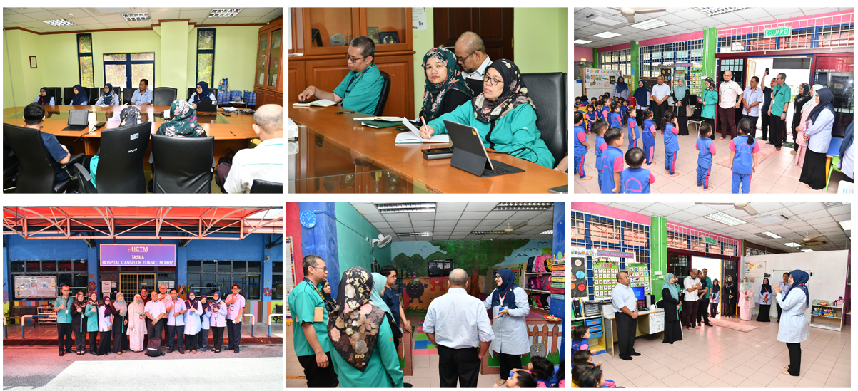 Hospital Canselor Tuanku Muhriz melalui Jabatan Pengurusan Fasiliti Bersepadu telah menerima kunjungan lawatan penanda aras dari Sultan Ahmad Shah Medical Centre @ IIUM pada 5 Jun 2024. Lawatan ini diadakan bertujuan untuk mendapatkan maklumat mengenai keperluan dan prosedur yang perlu dipatuhi, serta pendedahan dan pengetahuan berkaitan pengurusan pengoperasian taska. Seramai tujuh (7) orang pelawat dari SASMEC yang diketuai oleh YBhg. Prof. Dr. Zamzuri Zakaria@ Mohamad, Pengarah (Klinikal). Kehadiran pelawat telah disambut dan diberi penerangan ringkas oleh Puan Zuraidah Konil, Ketua Jabatan Fasiliti Bersepadu di Bilik Mesyuarat Jabatan. Seterusnya, lawatan diakhiri dengan melawat ke Taska, HCTM.
