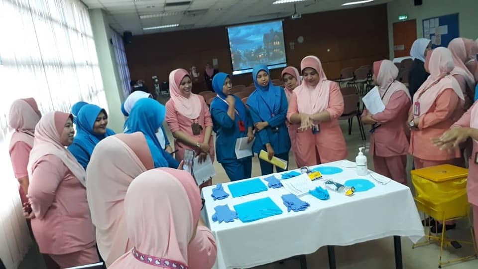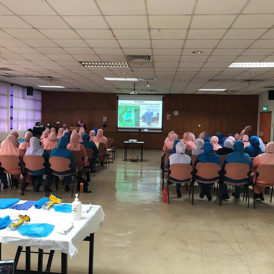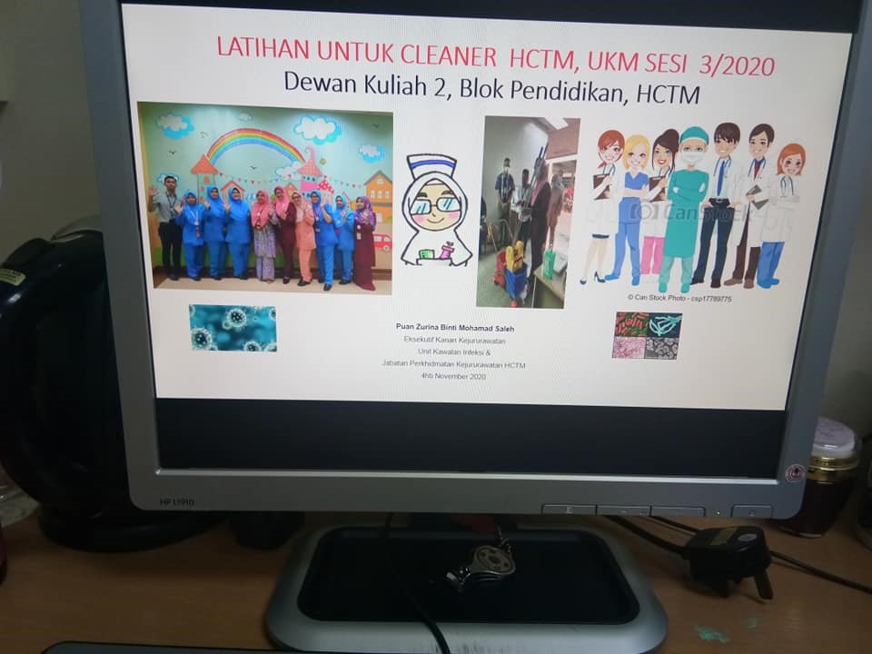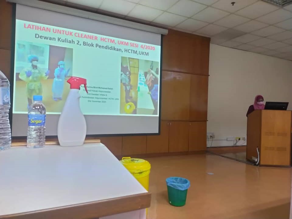 Latihan dan ceramah untuk 120 kakitangan pembersihan di HCTM. Topik ceramah berkaitan Pembersihan, Pembasmian Kuman, Arahan Dialution , Kebersihan Tangan, PPE, Donning dan Doffing, Pengurusan Sisa, Etika batuk, Arahan tumpahan, Kecederaan tajam & Mucosal Exposure.