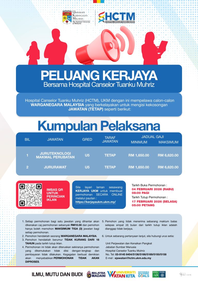 Hospital Canselor Tuanku Muhriz UKM ingin mempelawa warganegara Malaysia yang berkelayakan, komited serta berdedikasi untuk mengisi kekosongan jawatan di HCTM....