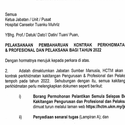 Pelaksanaan Pembaharuan Kontrak Perkhidmatan Kakitangan Pengurusan & Profesional dan Pelaksana Bagi Tahun 2022