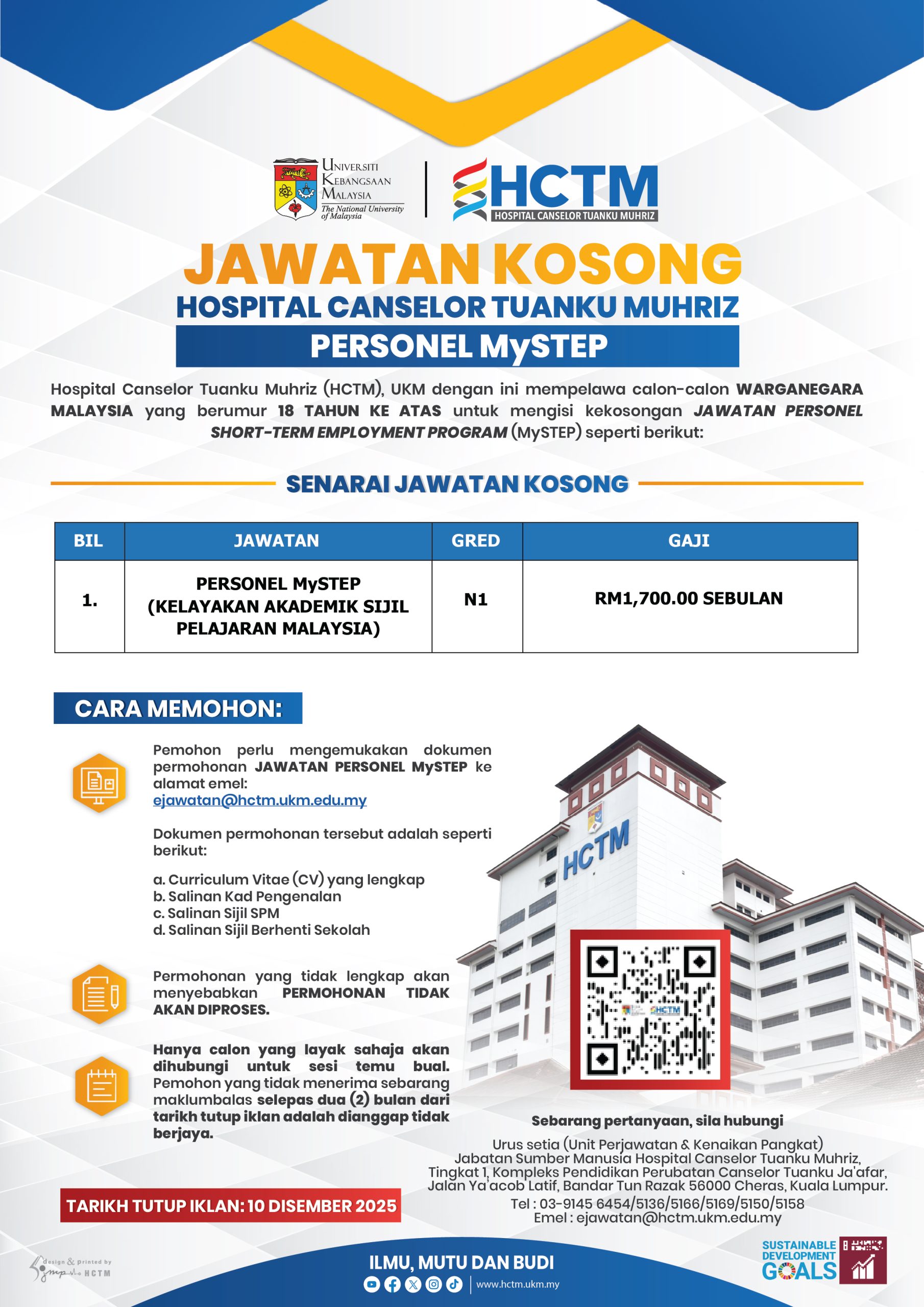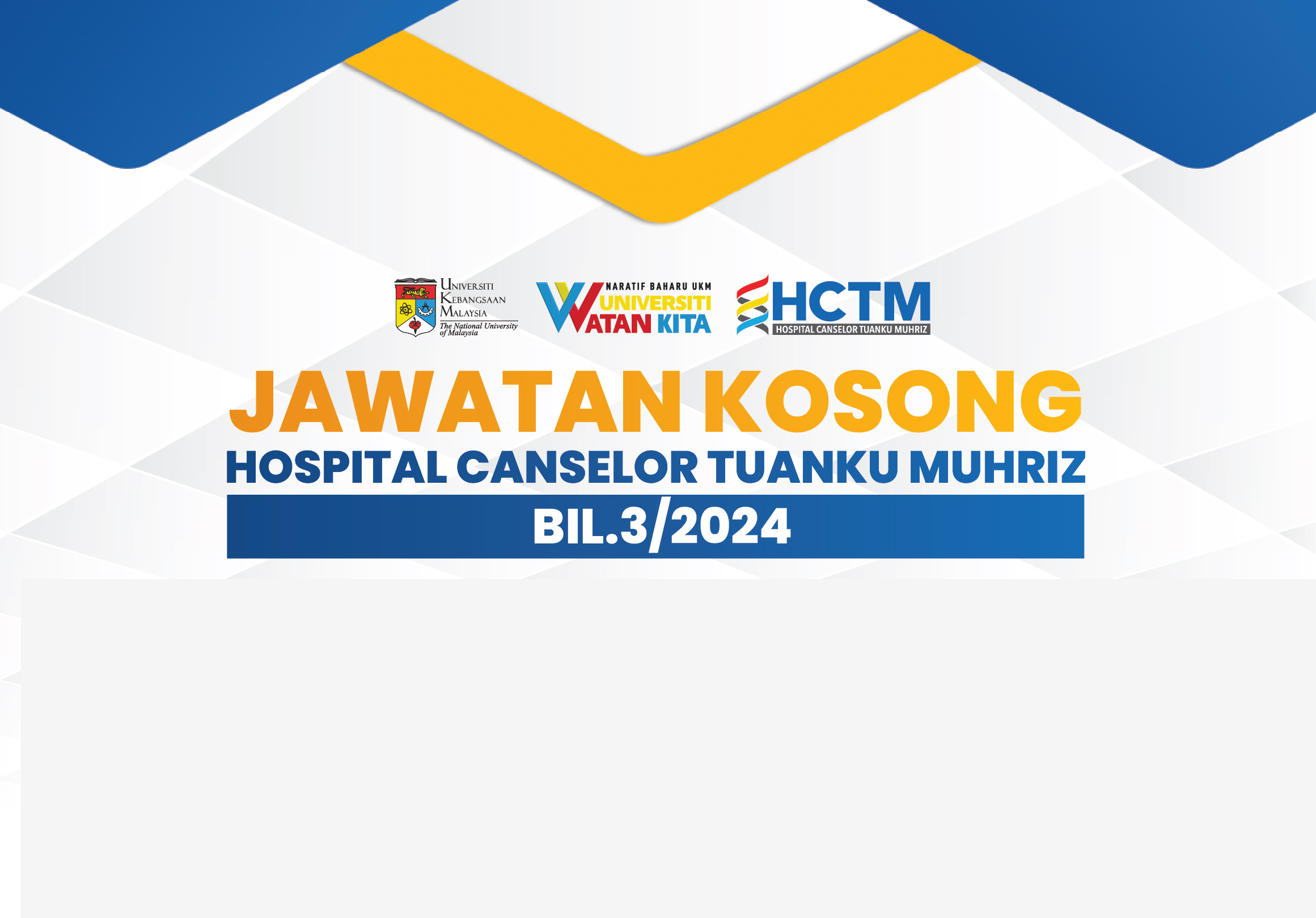 untuk mengisi kekosongan jawatan di Hospital Canselor Tuanku Muhriz (HCTM) UKM seperti berikut: