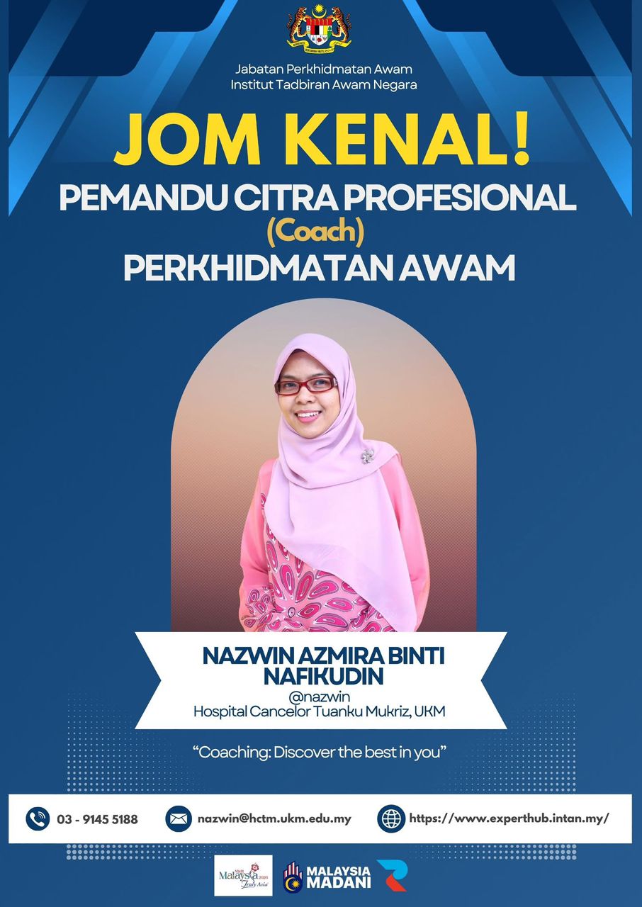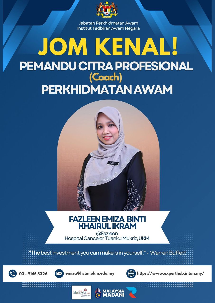Sukacita dimaklumkan bahawa dua (2) orang pegawai Hospital Canselor Tuanku Muhriz, UKM telah dilantik sebagai Pemandu Citra Profesional (Coach) Perkhidmatan Awam. Butiran pegawai tersebut adalah seperti di bawah:
