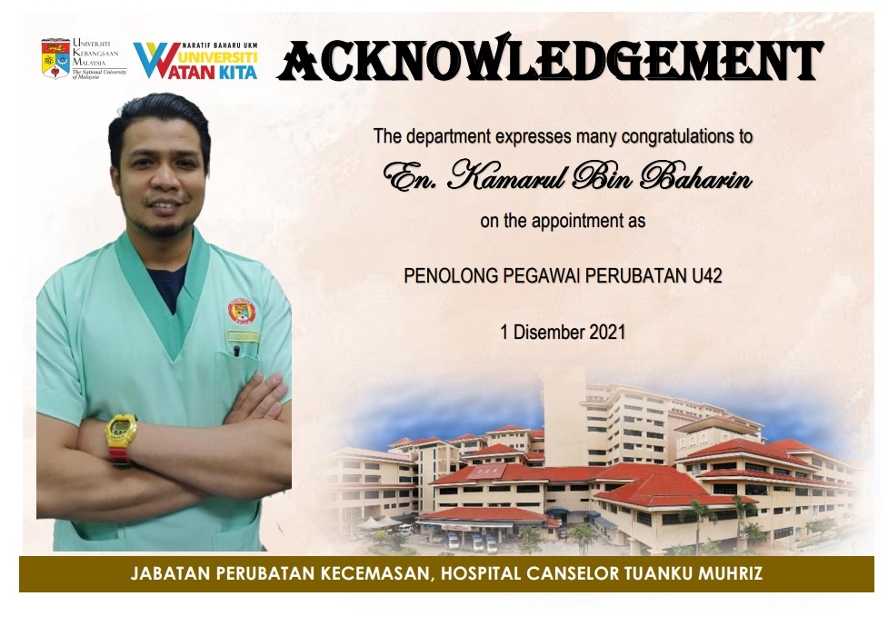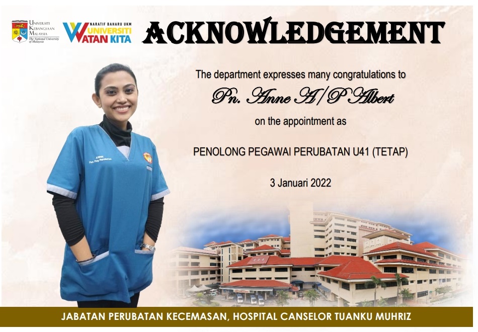 Pihak Jabatan mengucapkan setinggi-tinggi tahniah kepada En Muhamad Kamarul Bin Baharin di atas kenaikan pangkat beliau kepada Penolong Pegawai Perubatan U42 berkuatkuasa 1 Disember 2021 dan Puan Anne A/P Albert kepada Penolong Pegawai Perubatan U41 (Tetap) bermula 3 Januari 2022. Semoga menjadi pemangkin semangat kakitangan jabatan untuk terus memberikan perkhidmatan yang terbaik.