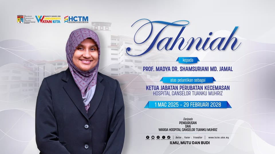 Tahniah diucapkan kepada Prof. Madya Dr. Shamsuriani Md. Jamal atas pelantikan sebagai Ketua Jabatan Perubatan Kecemasan, Hospital Canselor Tuanku Muhriz UKM berkuat kuasa pada 1 Mac 2025 hingga 29 Februari 2028.