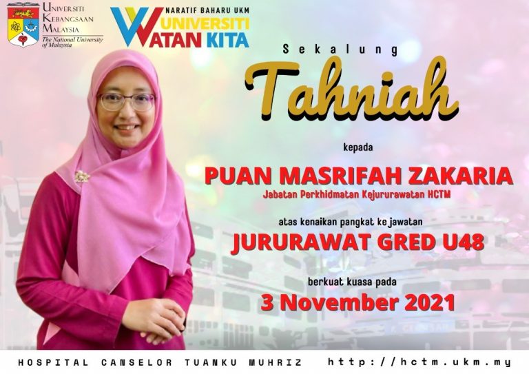 Tahniah diucapkan kepada Puan Masrifah Zakaria atas Kenaikan Pangkat ke jawatan Jururawat Gred U48, Hospital Canselor Tuanku Muhriz berkuat kuasa...