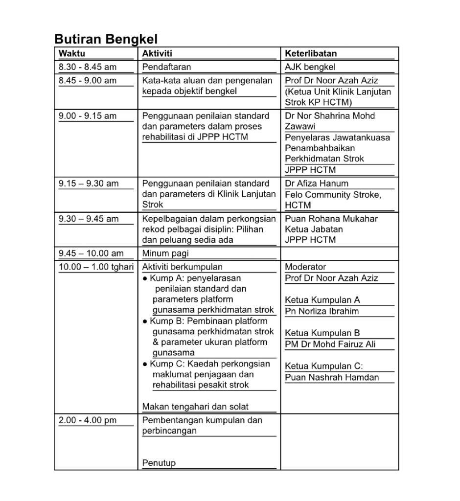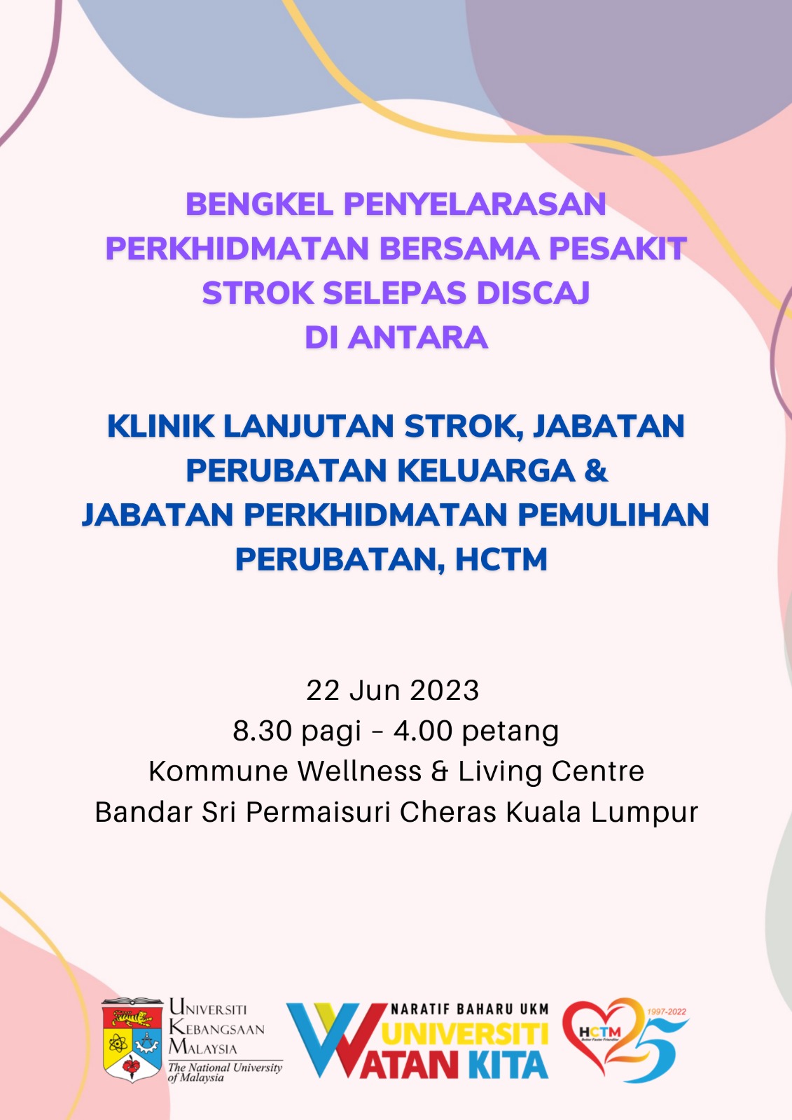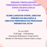 Bengkel Penyelarasan Perkhidmatan Bbersama Pesakit Strok Selepas Discaj antara Klinik Lanjutan Strok, Jabatan Perubatan Keluarga dan Jabatan Perkhidmatan Pemulihan Perubatan Hospital Canselor Tuanku Muhriz (HCTM) UKM telah diadakan pada 22 Jun 2023 (8.30 pagi – 4 petang) berempat di Kommune Wellness & Living Centre, Bandar Sri Permaisuri Cheras Kuala Lumpur.