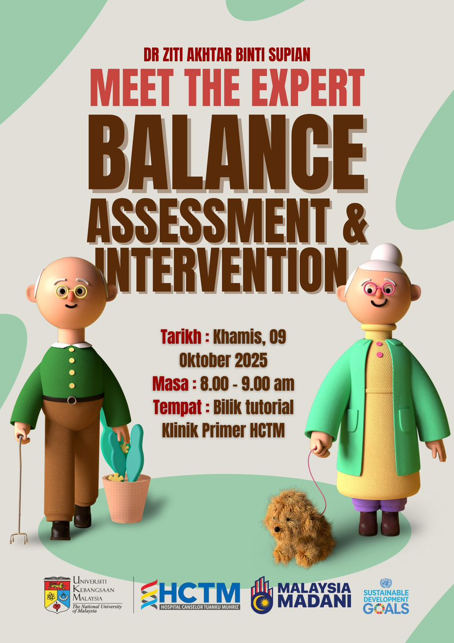 Setinggi-tinggi penghargaan dan ucapan terima kasih diucapkan kepada Dr. Ziti Akhtar binti Supian, Pakar Perubatan Keluarga dari Klinik Kesihatan Seri Kembangan, kerana kesudian beliau meluangkan masa dan berkongsi ilmu yang amat bernilai dalam sesi MEET THE EXPERT: Balance Assessment and Intervention yang telah berlangsung pada Khamis, 9 Oktober 2025 bertempat di Bilik Tutorial, Klinik Primer HCTM. Dr Ziti merupakan pakar perubatan keluarga dan juga telah berjaya menamatkan latihan dalam program Fellowship in Community Stroke Care , Jabatan Perubatan Keluarga.