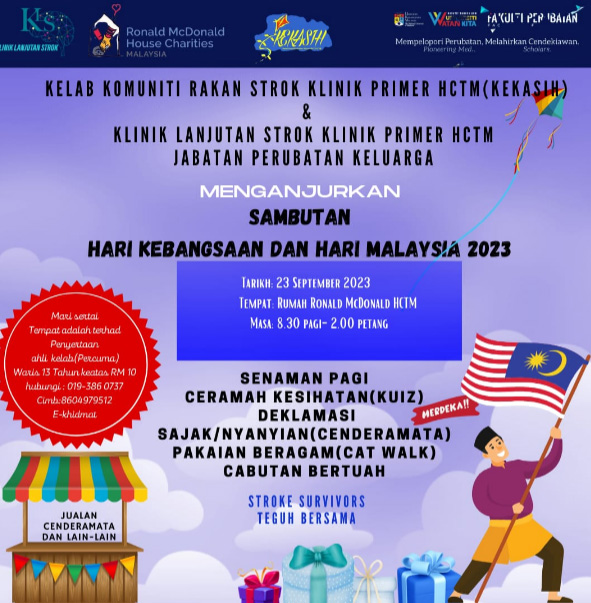 Sambutan Hari Kebangsaan Dan Hari Malaysia 2023 Kelab Komuniti Rakan Strok( KEKASIH) & KPPC telah diadakan pada 23 September 2023 (Sabtu Tengahari) jam 8.00 pagi-12.00 tengahari di Rumah Ronald McDonald HCTM. Program ini merupakan anjuran bersama Komuniti Ahli Strok Impikan Harapan (Kelab Kekasih). Seramai 57 orang peserta telah menyertai program ini yang terdiri daripada Pesakit strok serta waris, Kakitangan KPPC serta waris, dan kakitangan Rumah Ronal McDonald HCTM. Penganjuran program diadakan dengan tujuan memberi rasa keyakinan diri ahli-ahli yang tidak disisihkan dalam kelompok komuniti yang serba kekurangan dari segi mental dan fizikal berpeluang meraikan sempena bulan Kemerdekan dan Sambutan Hari Kebangsaan, sebagai titik tolak jati diri dan semangat juang ahli-ahli agar terus beraktiviti dalam menjaga siratul rahim dan kesihatan diri dalam komuniti, menyemarakkan lagi semangat dan kekuatan diri dan sokongan ahli keluarga serta komuniti pada golongan yang serba kekurangan selepas mengharungi detik-detik dan penderitaan sebagai pesakit yang telah pulih, serta semangat patriotik yang didedahkan dalam menghayati suasana sambutan dapat memberi impak