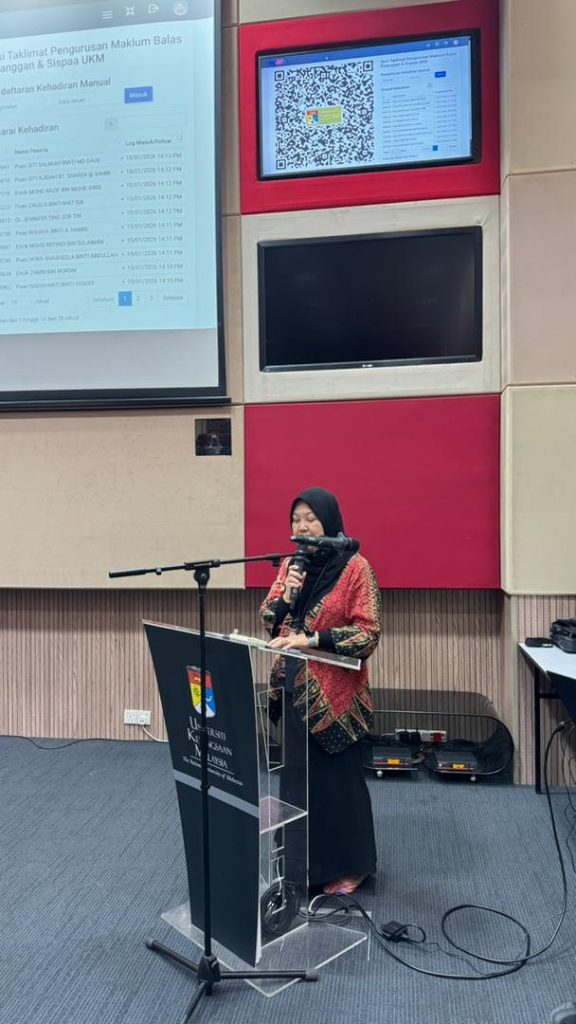 Sesi Taklimat Pengurusan Maklum Balas Pelanggan & SISPAA UKM telah diadakan pada 15 Januari 2026 (Khamis) bermula 2.00 petang hingga 4.30 petang bertempat di Auditorium Advanced Surgical Skills Centre (ASSC). Penceramah yang telah dijemput pada sesi taklimat ini ialah En. Saipulizam Abd. Ghani, Timbalan Pengarah (Pengurusan Korporat), Pusat Komunikasi Korporat (Komunikasi UKM). Turut hadir pada bengkel ini ialah YBrs. Dr. Noor Asyikin Jasni, Ketua Jabatan Kualiti HCTM, Cik Nurul Hafiza Mazlan, Pegawai Tadbir, Pusat Komunikasi Korporat (Komunikasi UKM), Pegawai-pegawai Perhubungan Aduan Jabatan dan wakil-wakil Jabatan.