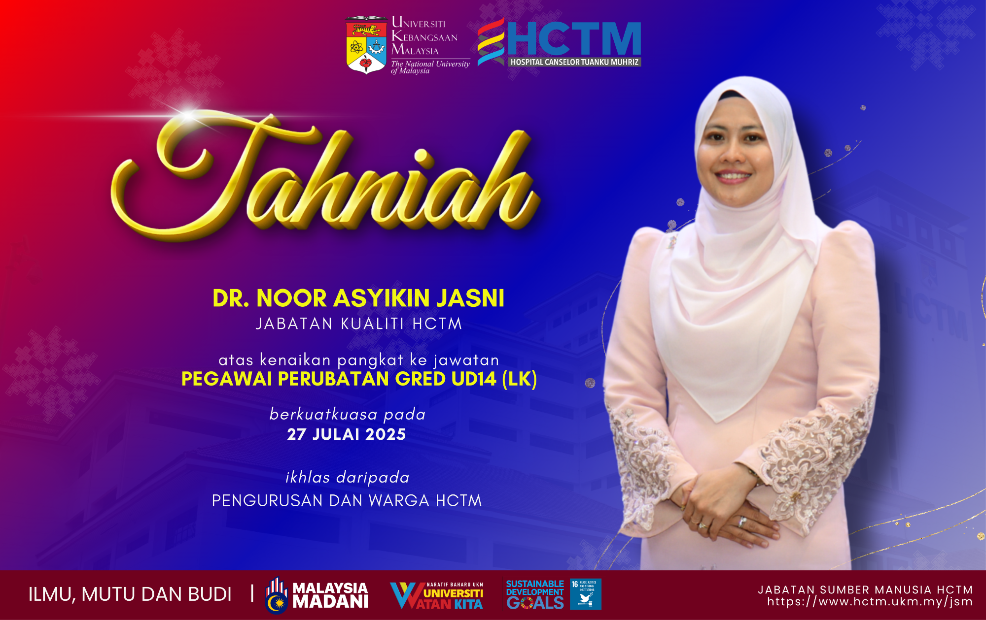 Tahniah dan syabas Dr. Noor Asyikin Jasni, Ketua Jabatan Kualiti, HCTM atas kenaikan pangkat ke jawatan Pegawai Perubatan Gred UD14 (LK) berkuatkuasa pada 27 Julai 2025.