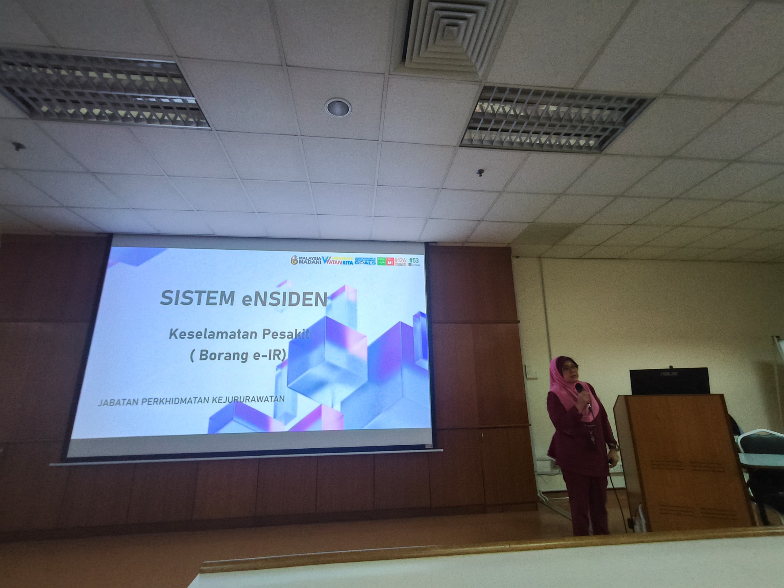 Turut hadir pada taklimat ini ialah YBrs. Dr. Noor Asyikin Jasni, Ketua Jabatan Kualiti HCTM. Pembentangan setiap modul berkaitan sistem insiden telah dilaksanakan oleh wakil-wakil terlibat yang terdiri daripada Unit Keselamatan dan Kesihatan Pekerjaan, Unit Kawalan Infeksi, Jabatan Perkhidmatan Kejururawatan, Jabatan Farmasi, Bahagian Keselamatan KKL, Jabatan Pembangunan Prasarana KKL dan Pejabat Pengarah HCTM.“