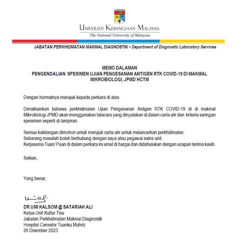Selasa, 2 Januari 2024, Unit Kultur Tisu Gugusan Mikrobiologi JPMD telah menganjurkan satu taklimat berkaitan Perkhidmatan Pengujian Segera Antigen COVID-19. Taklimat disampaikan oleh Dr Umi Kalsom@Satariah Ali. Taklimat ini bertujuan untuk memberi penerangan kepada kakitangan yang terlibat dalam Pengujian Segera Antigen COVID-19 untuk mengikuti prosedur terkini pengurusan pengujian ini yang merujuk perkeliling terkini. Semua permintaan perlu dibuat saringan yang ditetapkan sebelum melakukan pengujian.