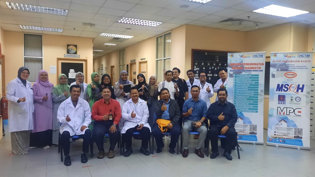 Lawatan penandaarasan seramai empat (4) orang pegawai yang diketuai puan Fariza Abdullah, Ketua Penlong Pengarah Kanan, Unit Pengujian Perubatan, Bahagian Akreditasi, Jabatan Standards Malaysia (JSM), Kementerian Pelaburan, Perdagangan dan Industri ke Jabatan Perkhidmatan Makmal Diagnostik (JPMD) HCTM pada hari ini.