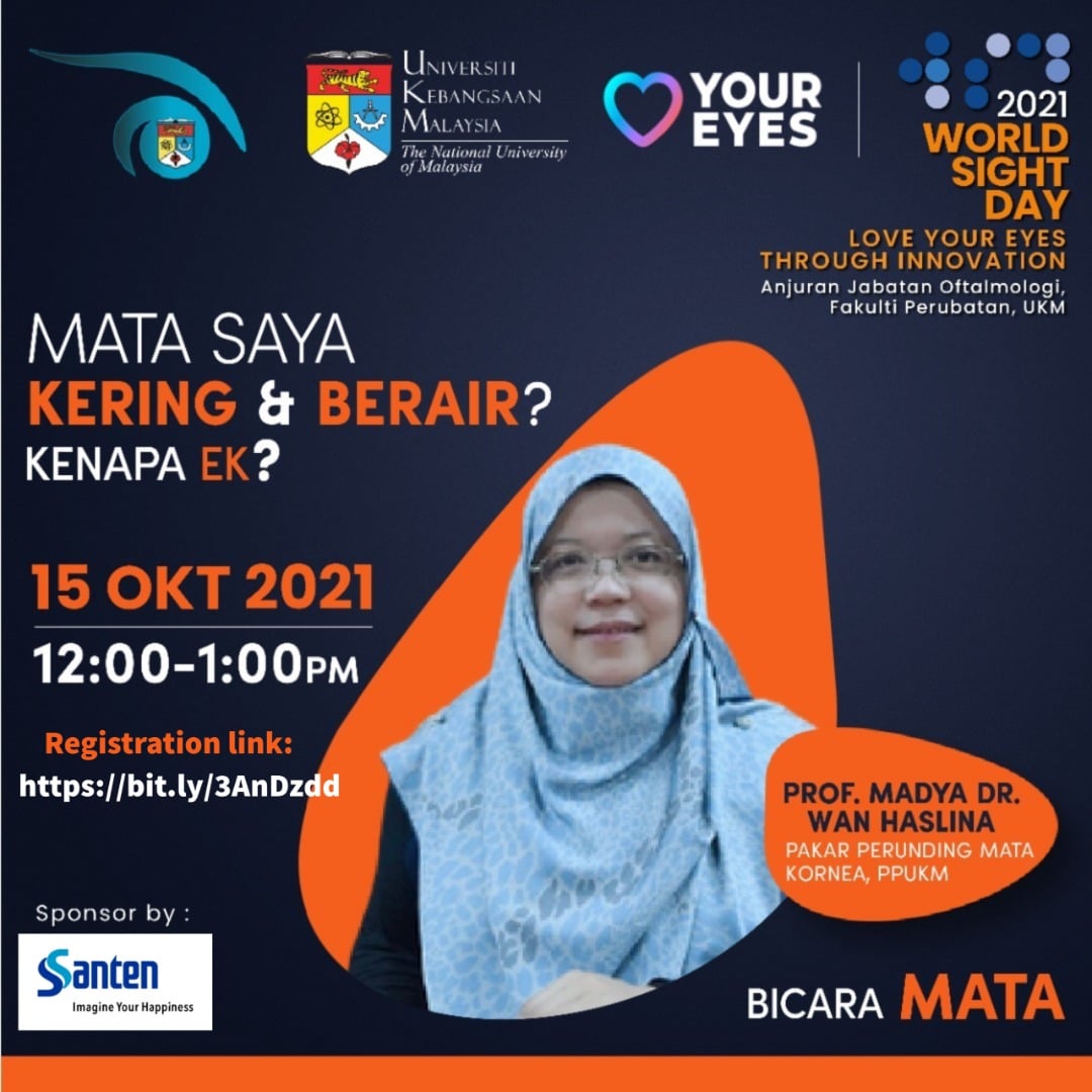 Bersempena dengan Hari Penglihatan Sedunia, Jabatan Oftalmologi HCTM menganjurkan Bicara Mata ‘Mata Saya KERING & BERAIR? Kenapa ek?’ oleh Prof. Madya Dr. Wan Haslina pada 15 Oktober 2021 jam 12.00-1.00 petang.