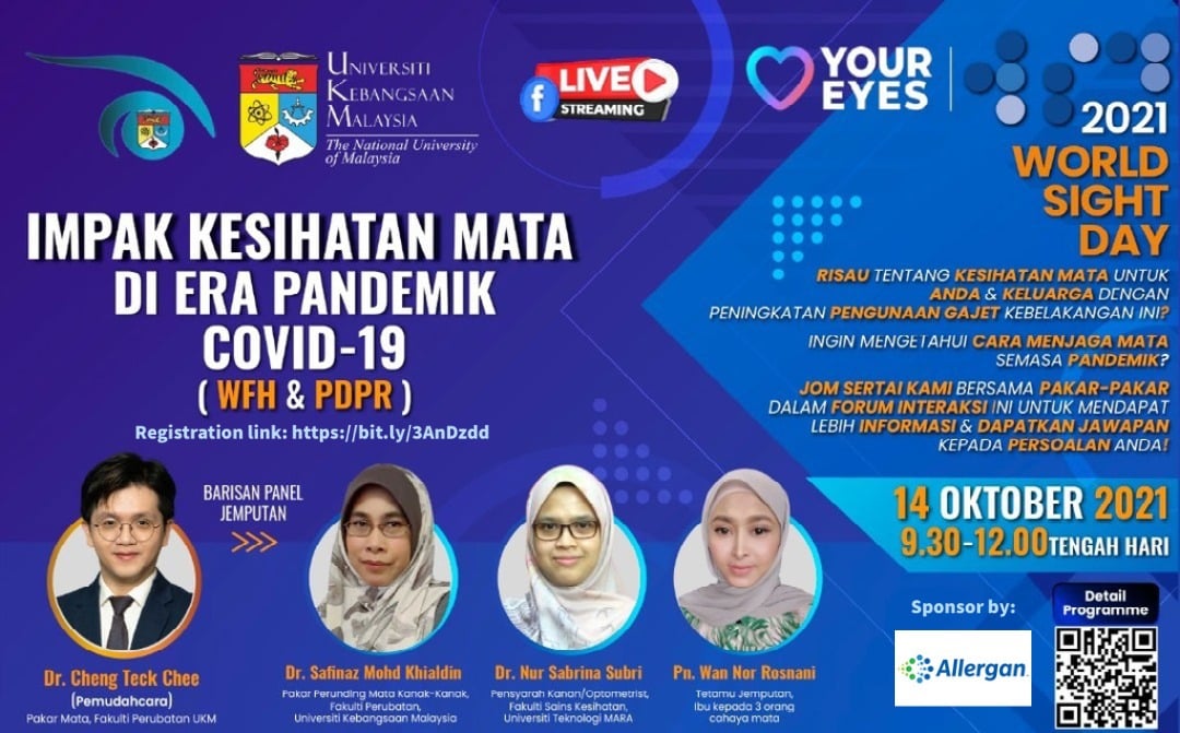 Bersempena Hari Penglihatan Sedunia, Jabatan Oftalmologi HCTM menjemput semua untuk menghadiri forum “Impak Kesihatan Mata di Era Pandemik COVID-19” seperti berikut: