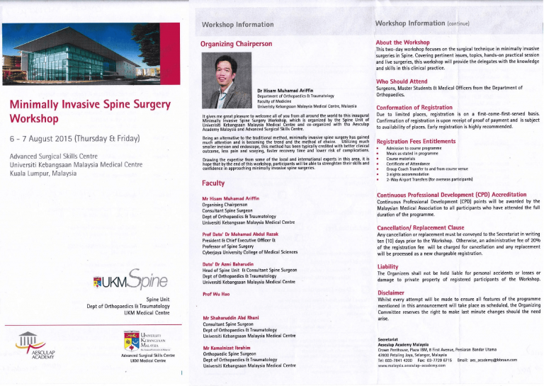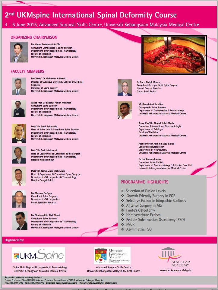 UKMspine International Spinal Deformity Course Tarikh: 4 – 5 Jun 2015 (Khamis & Jumaat) Venue: Advanced Surgical Skills Centre, HCTM, PPUKM