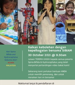 30 OKTOBER 2021![]() | PERTANDINGAN VIDEO BAKAT SEMPENA HARI SPINA BIFIDA & HYDROEPHALUS SEDUNIA 2021 Spina Bifida Association Malaysia in Collaboration with Rehabilitation Medicine Unit, UKM 30 Oktober 2021 - Prof. Dr Amaramalar Selvi Naicker (SIBIAM President, Head of Rehabilitation Medicine Unit, HCTM UKM) - Assoc Prof Dr Rashidah Ismail (HCTM UKM) - Dr. Brenda Saria Yuliawiratman (HCTM UKM) |
