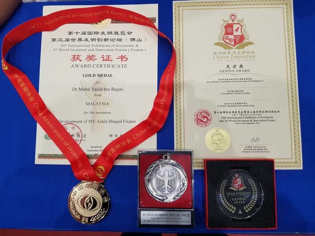 Tahniah diucapkan kepada Prof. Madya Dr. Mohd. Yazid Bajuri yang terus cemerlang dengan memenangi PINGAT EMAS di ’30th International Invention, Innovation & Technology Exhibition Malaysia 2019 yang telah berlangsung di Kuala Lumpur Convention Center, Malaysia pada 2-4 Mei 2019 Gold Awards in ITEX 2019 – 30th International Invention, Innovation & Technology Exhibition Malaysia. [Invention – Future Ankle Hinged Fixator]