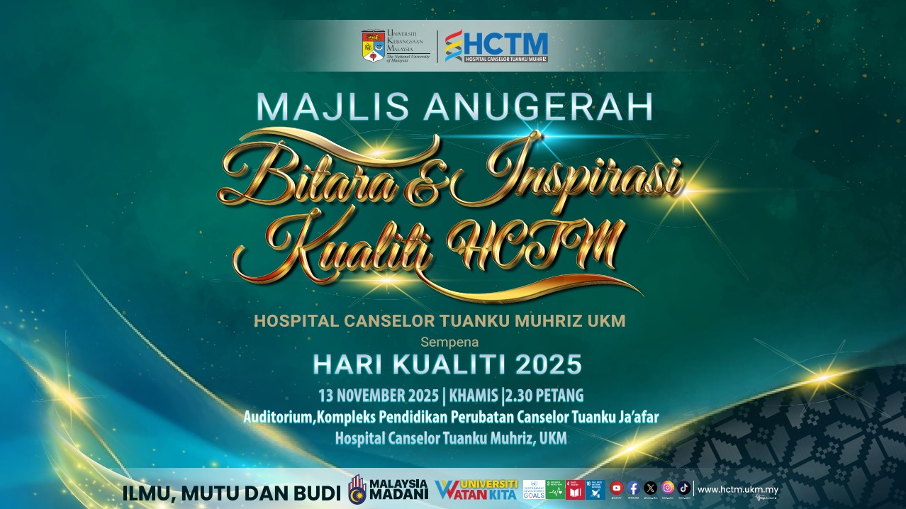 Majlis Anugerah Bitara dan Inspirasi Kualiti Hospital Canselor Tuanku Muhriz (HCTM), Universiti Kebangsaan Malaysia (UKM) telah berlangsung dengan penuh meriah pada 13 November 2025 (Khamis) bertempat di Auditorium Kompleks Pendidikan Perubatan Canselor Tuanku Ja’afar, HCTM. Ucapan telah disampaikan oleh YBhg. Dato’ Dr. Azmi Baharudin, Pengarah HCTM.