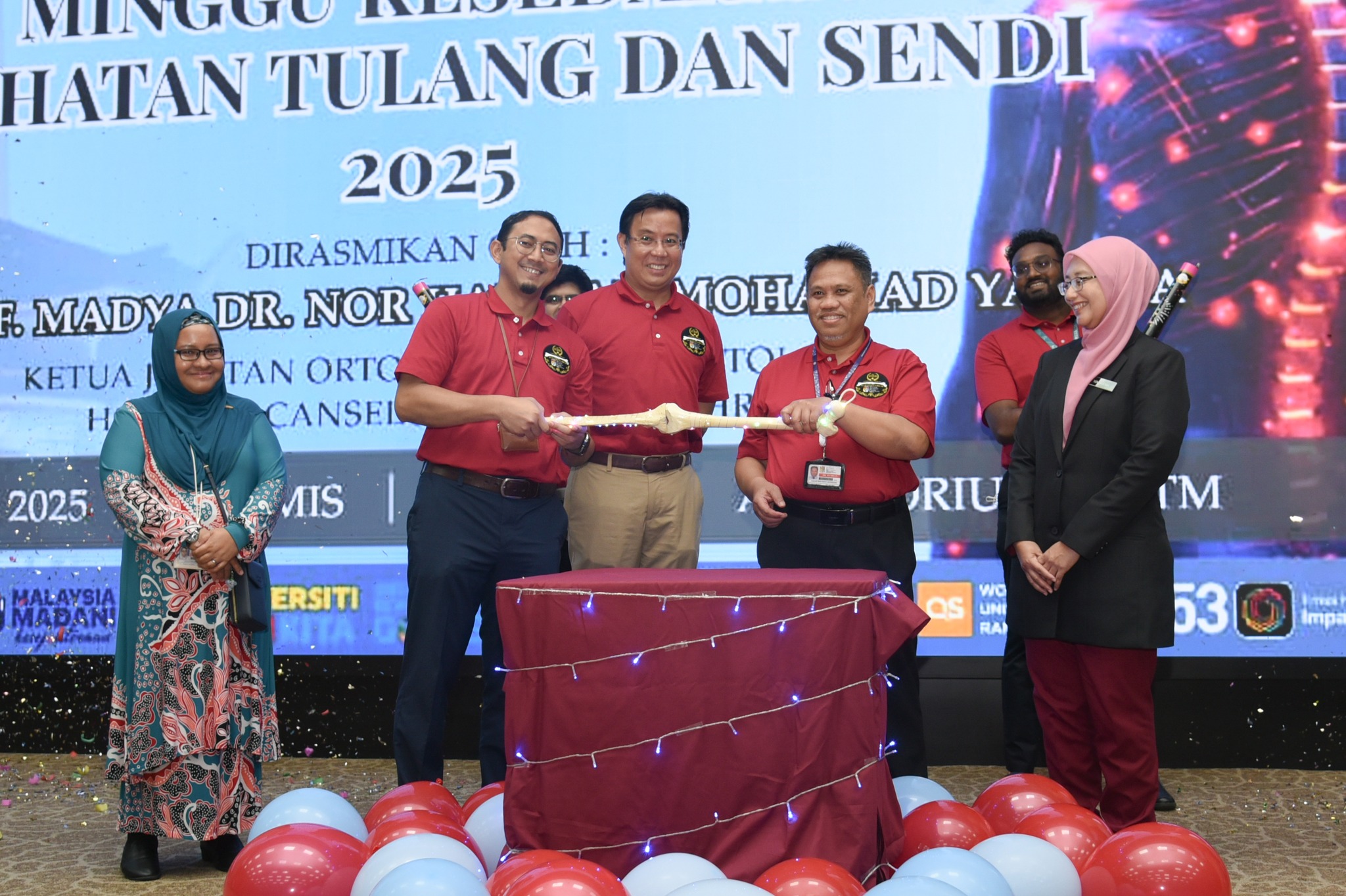 Turut hadir memeriahkan majlis ini, YBrs. Prof. Madya Dr. Norazlin Kamal Nor, Timbalan Pengarah (Perubatan), Hospital Tunku Ampuan Besar Tuanku Aishah Rohani, Hospital Pakar Kanak- kanak, UKM, YBhg. Prof. Datuk Dr. Sabarul Afian Mokhtar, Penasihat Program Minggu Kesedaran Kesihatan Tulang dan Sendi 2025, YBrs. Puan Masrifah Zakaria, Ketua Perkhidmatan Kejururawatan HCTM, Ketua-ketua Jabatan, Pegawai-pegawai Kanan UKM dan warga UKM.