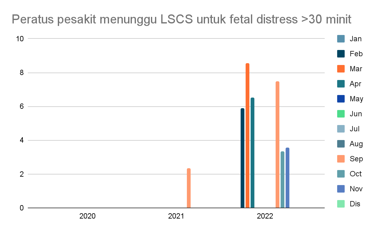 - Peratus pesakit yang menjalani pembedahan Lower Segment Caesarean Section (LSCS) atas indikasi fetal distress yang terpaksa menunggu lebih 30 minit sebelum pembedahan dijalankan adalah kurang daripada 0%