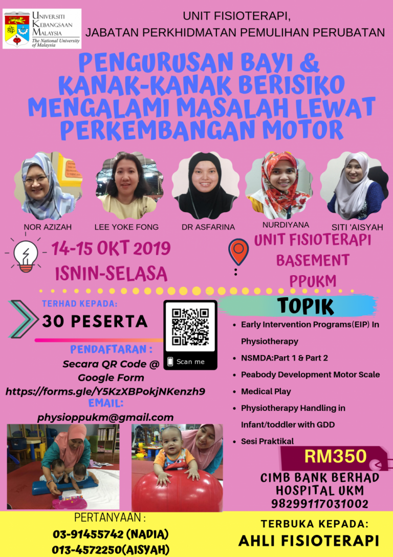 UNIT FISIOTERAPI JPPP HCTM menganjurkan Bengkel Pengurusan Bayi & Kanak-kanak Berisiko Mengalami Masalah Lewat Perkembangan Motor .. Pelbagai topik akan dibentangkan dan sesi turut diadakan sesi praktikal semasa bengkel dijalankan.. TARIKH: 14 & 15 OKTOBER 2019 HARI : ISNIN DAN SELASA TEMPAT : ARAS BAWAH, UNIT FISIOTERAPI JAB PERKHIDMATAN PEMULIHAN PERUBATAN HCTM PPUKM YURAN : […]