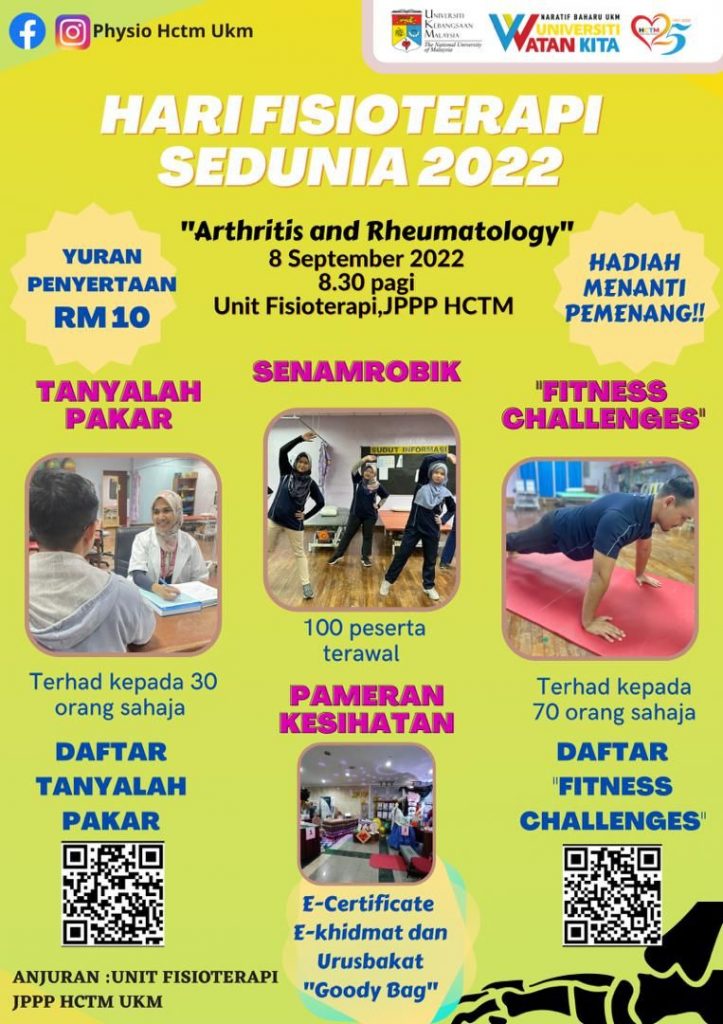 Unit Fisioterapi, Jabatan Perkhidmatan Pemulihan Perubatan, HCTM akan menganjurkan Sambutan Hari Fisioterapi Sedunia 2022 pada 8 September 2022 dengan bertemakan “Arthritis and Rheumatology”.
