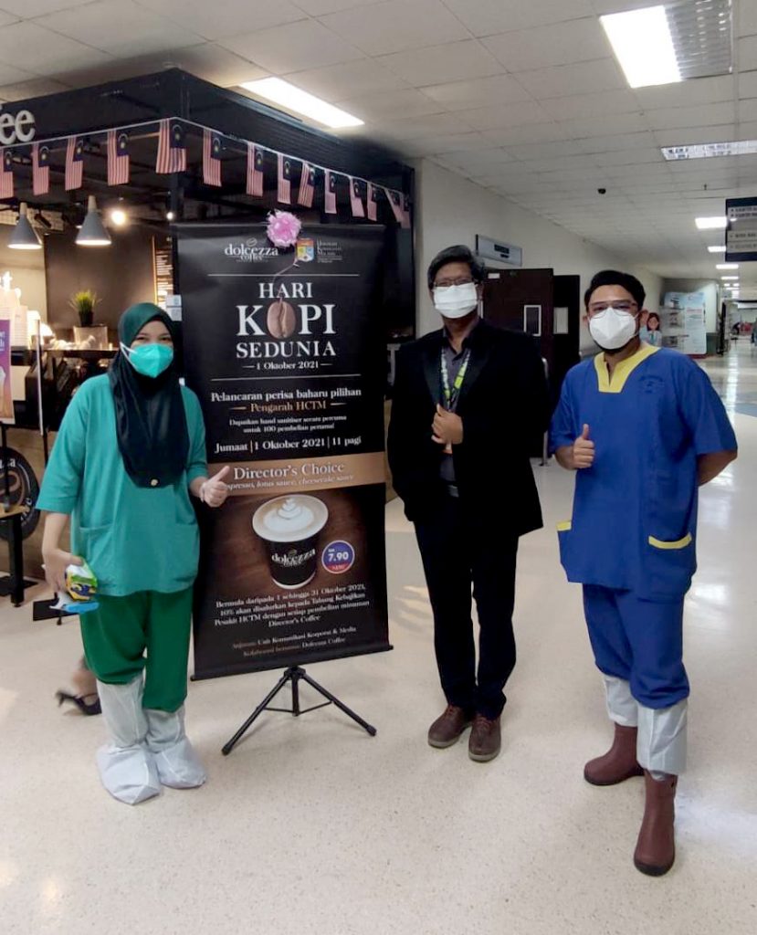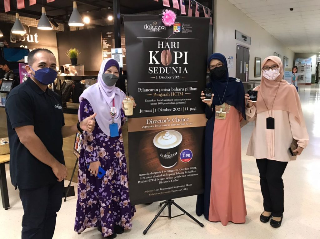 Cheras, 1 Oktober 2021 – Sempena Hari Kopi Sedunia yang jatuh pada 1 Oktober setiap tahun, Dolcezza Cafe dengan kerjasama HCTM telah melancarkan ‘Director’s Coffee’. Setiap pembelian Director’s Coffee mulai 1 Okt 2021 sehingga 31 Okt 2021, sebanyak 10% akan disumbangkan ke dalam Tabung Kebajikan Pesakit HCTM. Hadir merasmikan pelancaran ini tadi ialah Prof. Dato’ Dr. Razman Jarmin, Pengarah HCTM. Objektif pelancaran kopi ini adalah untuk membina jaringan dengan rakan industri disamping menambah dana untuk Tabung Kebajikan Pesakit HCTM. Program ini juga turut membuka ruang kepada warga HCTM boleh bergambar kenang-kenangan bersama Pengarah.