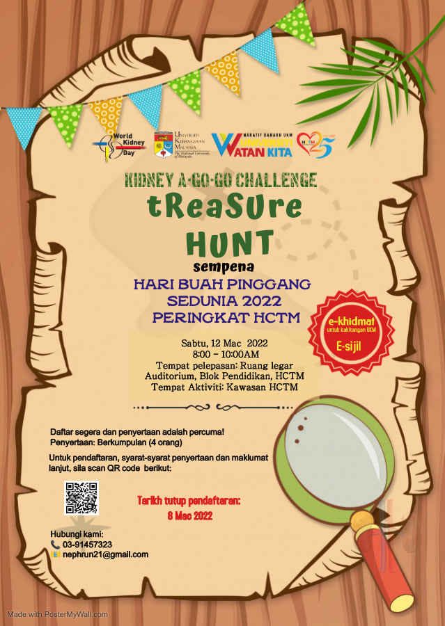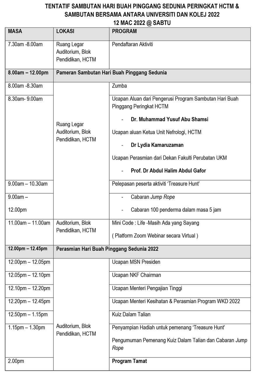 Sempena Sambutan Hari Buah Pinggang Sedunia 2022 HCTM, Unit Nefrologi, Jabatan Perkhidmatan Kejururawatan HCTM dengan kerjasama National Kidney Foundation of Malaysia (NKF) & Malaysian Society Nephrology (MSN) mempelawa warga HCTM, UKM, dan orang awam untuk menyertai sambutan ini pada:-