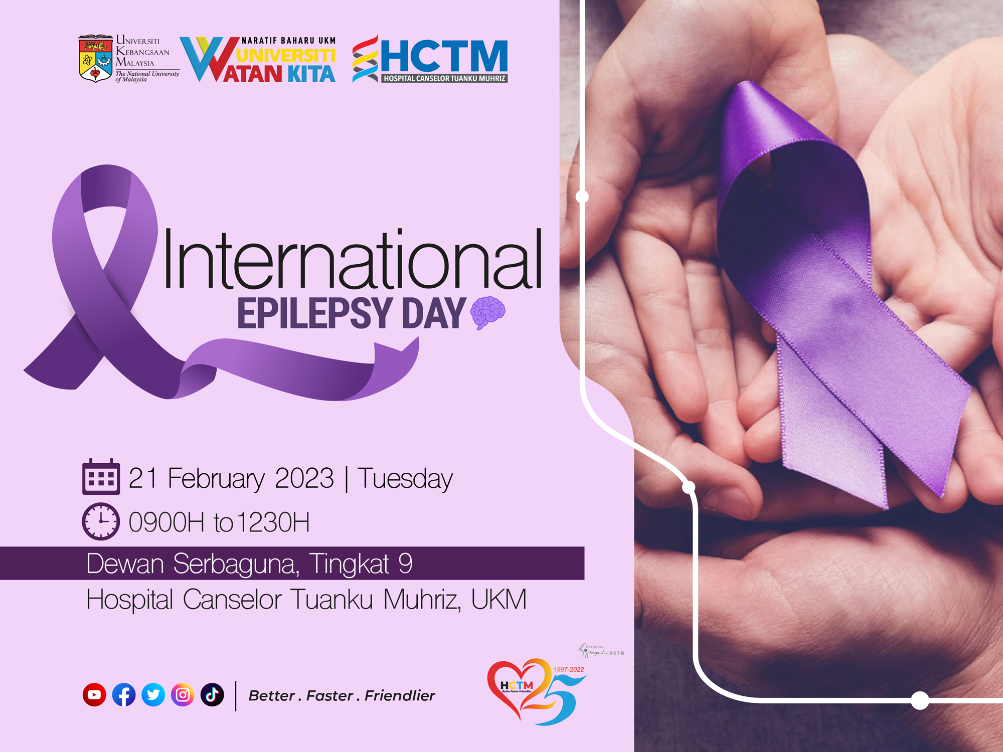 Sambutan Hari Epilepsi 2023 anjuran Unit Neurologi Jabatan Perubatan akan diadakan pada 21 Februari 2023 (Selasa) jam 8.00 pagi di Dewan Serbaguna, Tingkat 9, Blok Klinikal, Hospital Canselor Tuanku Muhriz.