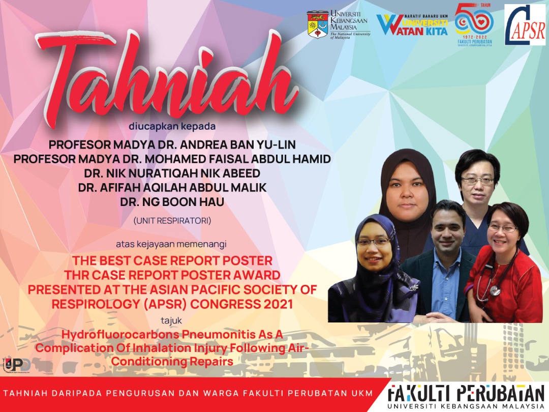 Tahniah kepada Prof. Madya Dr. Andrea Ban Yu-Lin, Prof. Madya Dr. Mohamed Faisal Abdul Hamid, Dr. Nik Nuratiqah Nik Abeed, Dr. Afifah Aqilah Abdul Malik dan Dr. Ng Boon Hau dari Unit Respiratori atas kejayaan memenangi The Best Case Report Poster Award Presented At The Asian Pasific Society Of Respirology (APSR) Congress 2021 yang bertajuk Hydrofluorocarbons Pneumonitis As A Complication Of Inhalation Injury Following Air-Conditioning Repairs.