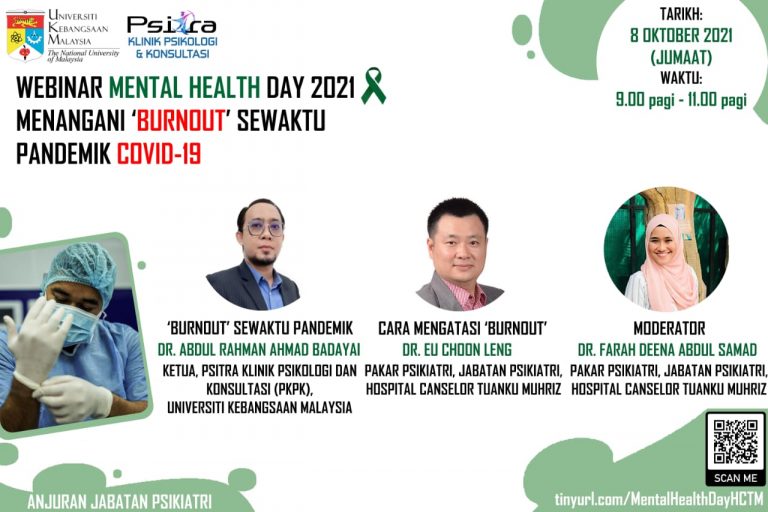 Bersempena dengan Hari Kesihatan Mental Sedunia 2021, Jabatan Psikiatri HCTM menganjurkan webinar "Menanangi Burnout Sewaktu Pandemik Covid-19" pada 8 Oktober...