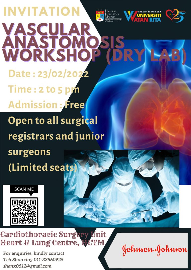 Vascular Anastomosis Workshop (Dry Lab) akan diadakan pada 23 Februari 2022 pada jam 2.00-5.00 petang. Penyertaan adalah percuma dan terbuka kepada semua doktor...