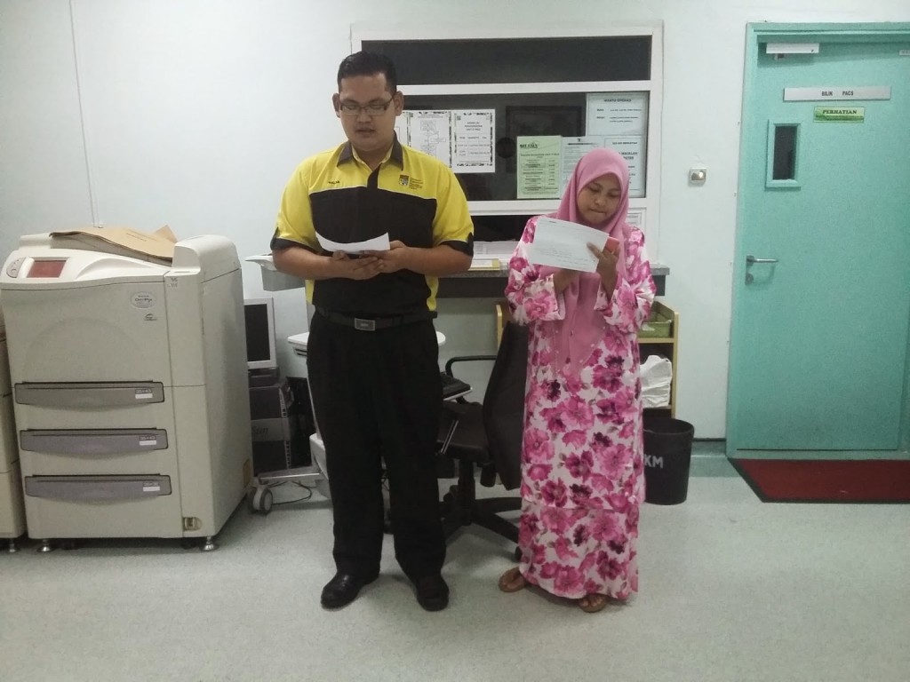 Perhimpunan diteruskan dengan pengumuman. Pengumuman pada hari ini adalah mengenai pesanan dari En. Mohd Sharmiezul Mohd Saharin kepada semua Juru X-ray mengenai kepentingan untuk mengutamakan kes strok bagi pemeriksaan urgent CT Scan dari Jabatan Perubatan Kecemasan. Setiap saat amat berharga bagi kes stroke, setiap persiapan perlu dilakukan dengan segera (persediaan mesin, media kontras dan sebagainya) bagi mempercepatkan kes untuk dilakasanakan.